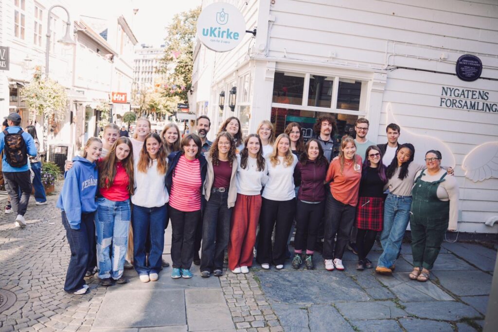 Pildil 2025/2026 aastal Norra Misjoniseltsi korraldatavast Ucrew misjonipraktikast osavõtjad Stavangeris, enne sihtkohtadesse teeleminekut.