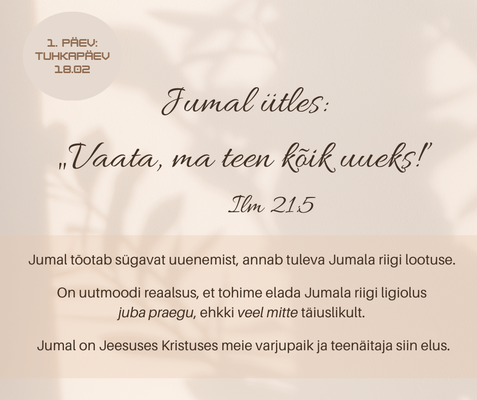 Pakume siin kodulehel alates tuhkapäevast 2026 lühitekste, mis aitavad juhtida mõtted tavaelust kõrgemale. Kalendri autor Kaisa Rahja: “Paastuaeg on rahunemise, mõtisklemise ja keskendumise aeg, et kohtuda Jumalaga Jumala Sõnas ja palves kas üksi või koos teistega. Kes tahab, võib paastuaja seitsme nädala jooksul millestki loobuda, näiteks nagu lihast või maiustustest. Võib püüda rohkem palvetada või külastada üksildasi inimesi. Oma vagad teod on parem hoida enda teada. Jumala õnnistust meile kõigile!”